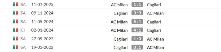 Xét về lịch sử đối đầu, AC Milan là đội nắm ưu thế rõ rệt khi chạm trán Cagliari trong nhiều năm qua. Trong 10 lần gặp nhau gần nhất tại Serie A, Milan thắng tới 7 trận, hòa 2 và chỉ thua 1.