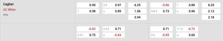 Bảng tỷ lệ kèo Cagliari vs AC Milan: