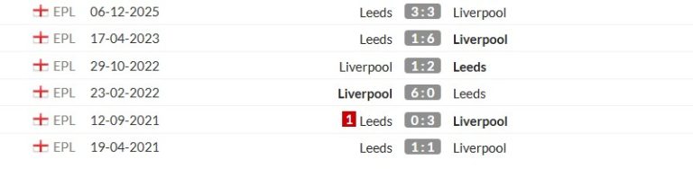 Xét về lịch sử đối đầu, Liverpool hoàn toàn chiếm ưu thế trước Leeds United trong kỷ nguyên Ngoại hạng Anh. Trong 6 lần gặp nhau gần nhất, Liverpool thắng 5 và chỉ hòa 1, ghi tổng cộng hơn 15 bàn thắng – trung bình gần 2.5 bàn/trận.