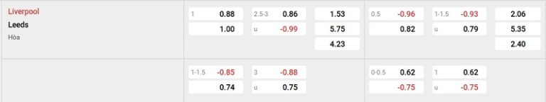 Bảng tỷ lệ kèo Liverpool vs Leeds United: