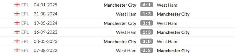 Lịch sử đối đầu giữa Man City và West Ham trong những mùa gần đây cho thấy sự thống trị tương đối rõ rệt của đội chủ nhà. Xét trong khoảng 10 trận gặp nhau gần nhất, Man City chiếm ưu thế với nhiều trận thắng áp đảo cả về tỷ số và thế trận.