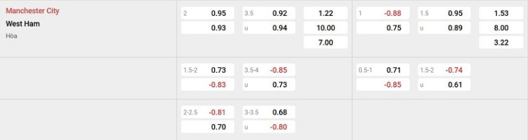 Bảng tỷ lệ kèo Man City vs West Ham: